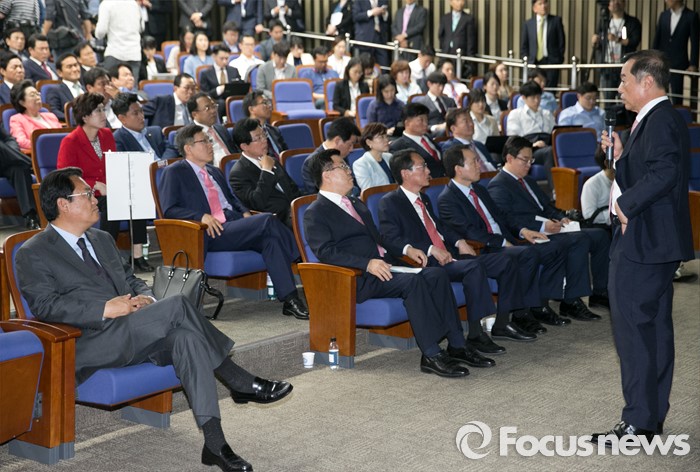 (서울=포커스뉴스) 정진석 새누리당 원내대표 등 참석자들이 9일 오후 서울 여의도 국회에서 열린 20대 총선 당선자 총회에 참석해 노무현 정부 청와대 정책실장을 지낸 김병준 국민대 교수의 특강을 듣고 있다.