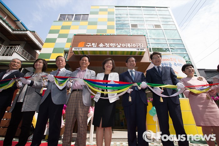 (서울=포커스뉴스) 9일 오후 서울 성동구 송정햇살어린이집에서 열린 서울시 1000번째 국공립어린이집 개원식에 박원순(오른쪽 세번째) 서울시장과 정원오 성동구청장, 참석내빈들이 테이프커팅을 하고 있다.