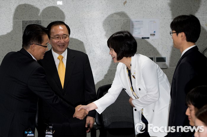(서울=포커스뉴스) 박지원(왼쪽) 국민의당 원내대표가 9일 오후 서울 여의도 국회에서 노회찬(왼쪽 두 번째) 정의당 원내대표를 비롯한 신임 원내대표단과 면담에 앞서 인사하고 있다.