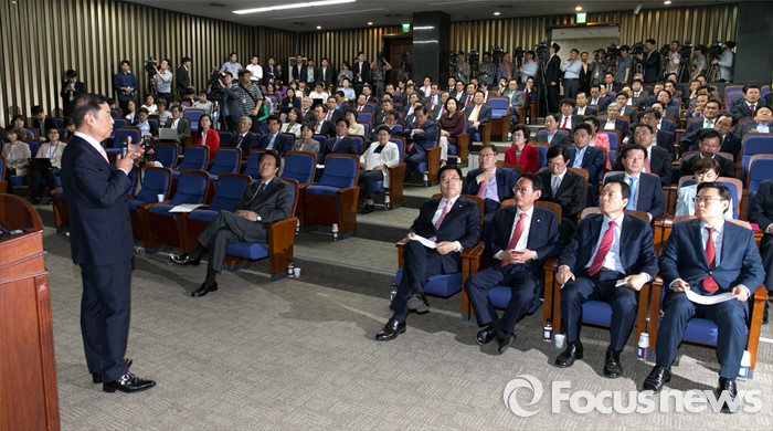 (서울=포커스뉴스) 9일 오후 서울 여의도 국회에서 열린 새누리당 20대 총선 당선자 총회에 참석한 정진석 원내대표 등 당선인 및 의원들이 노무현 정부 청와대 정책실장을 지낸 김병준 국민대 교수의 특강을 듣고 있다.