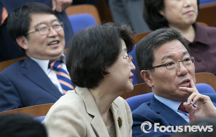 (서울=포커스뉴스) 9일 오후 서울 여의도 국회에서 열린 새누리당 20대 총선 당선자 총회에 참석한 윤상직(오른쪽), 김승희(가운데) 당선인이 대화하고 있다. 왼쪽은 백승주 당선인.