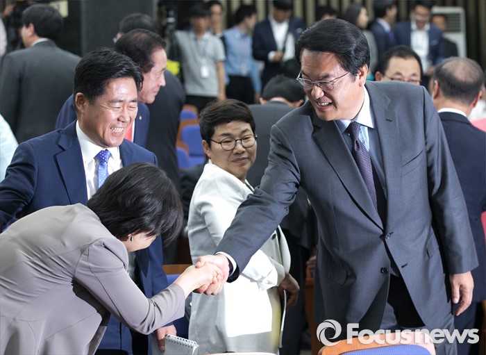 (서울=포커스뉴스) 9일 오후 서울 여의도 국회에서 열린 새누리당 20대 총선 당선자 총회에 참석한 정진석(오른쪽) 원내대표가 참석자들과 인사하고 있다.
