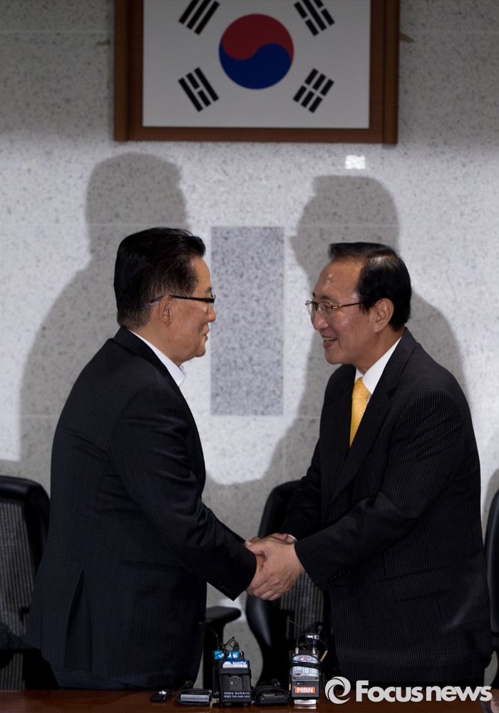 (서울=포커스뉴스) 박지원(왼쪽) 국민의당 원내대표와 노회찬 정의당 원내대표가 9일 오후 서울 여의도 국회에서 면담에 앞서 악수하고 있다.