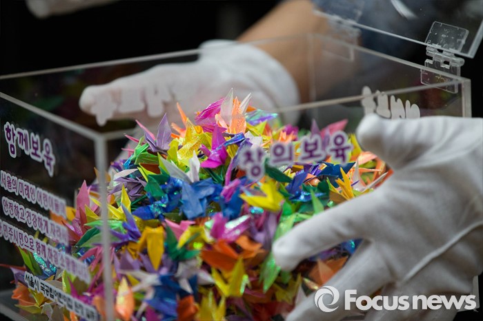 (서울=포커스뉴스) 9일 오후 서울 송파구 아이코리아에서 열린 '보육교직원 결의대회'에 참석한 보육관계자들이 참된 보육을 기원하는 종이학을 박원순 서울시장에게 전달하고 있다.