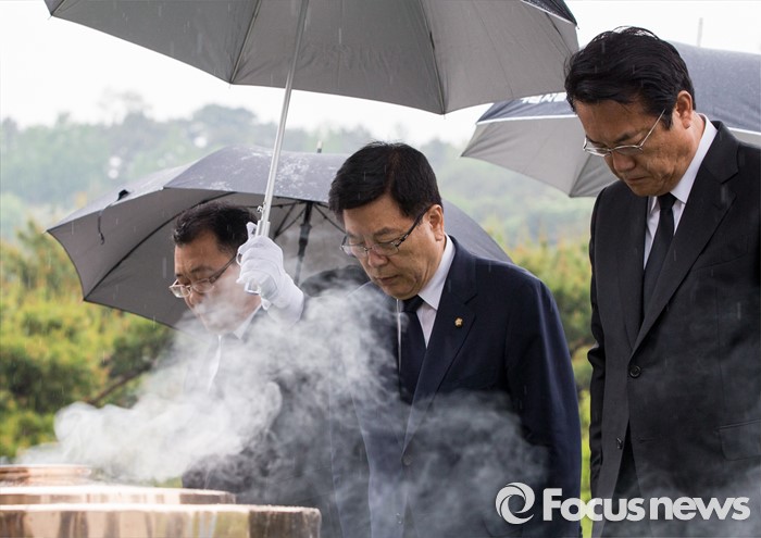 (서울=포커스뉴스) 10일 오전 서울 동작구 국립현충원을 찾은 정진석(맨 오른쪽) 새누리당 신임 원내대표와 김광림 신임 정책위의장이 묵념하고 있다.