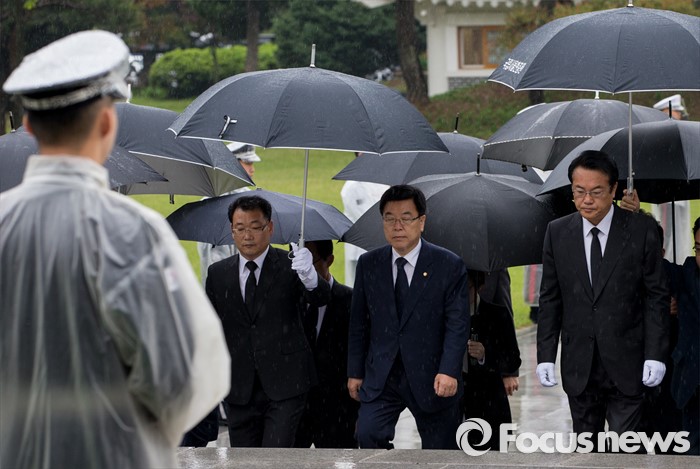 (서울=포커스뉴스) 10일 오전 서울 동작구 국립현충원을 찾은 정진석(맨 오른쪽) 새누리당 신임 원내대표와 김광림 신임 정책위의장이 분향단으로 발걸음을 옮기고 있다.