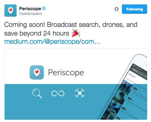 페리스코프의 공동 창립자이며 트위터에서 페리스코프 팀을 맡고 있는 케이본 베익포어(Kayvon Beykpour)는 "출시된 지 갓 1년 밖에 되지 않았지만 페리스코프를 통해 중계되는 영상의 숫자가 크게 증가했다"며 "더많은 이용자들이 생방송을 시도하고 전세계 각지에서 벌어지는 일들을 공유하기를 바라는 마음에서 영상 저장 기능을 확대하고 검색과 드론 중계 등 다양한 추가 기능을 도입하게 되었다"고 전했다.
