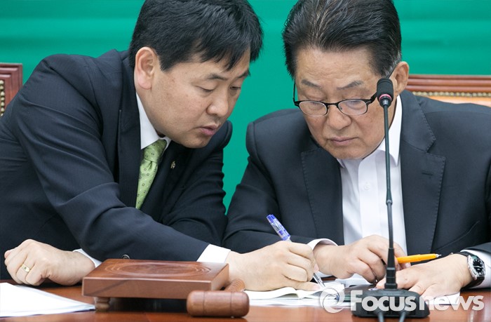 (서울=포커스뉴스) 박지원(오른쪽) 국민의당 원내대표와 김관영 원내수석부대표가 10일 오전 서울 여의도 국회에서 열린 원내대책회의에 참석해 대화하고 있다.