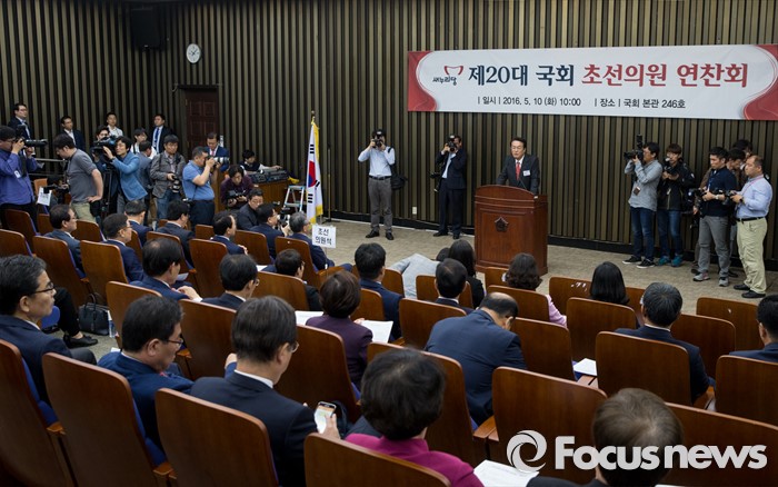 (서울=포커스뉴스) 10일 오전 서울 여의도 국회에서 열린 새누리당 제20대 국회 초선의원 연찬회에 참석한 정진석 신임 원내대표가 인사말을 하고 있다.