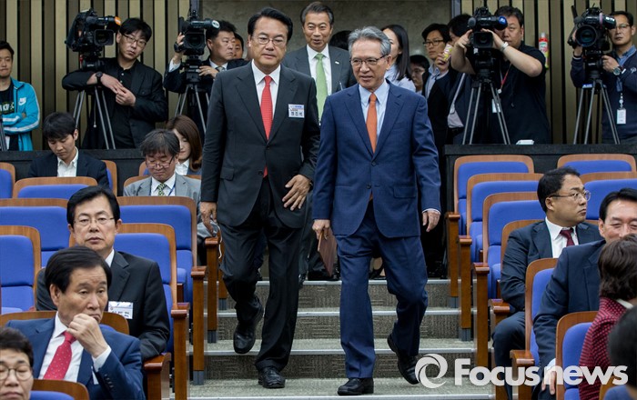 (서울=포커스뉴스) 10일 오전 서울 여의도 국회에서 열린 새누리당 제20대 국회 초선의원 연찬회에 정진석(왼쪽) 신임 원내대표와 김형오 전 국회의장이 입장하고 있다.