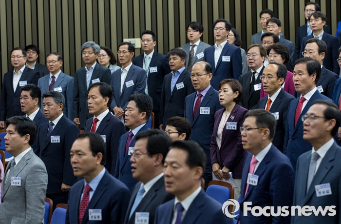(서울=포커스뉴스) 10일 오전 서울 여의도 국회에서 열린 새누리당 제20대 국회 초선의원 연찬회에 참석한 초선 의원들이 애국가를 부르고 있다.