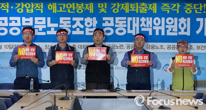 (서울=포커스뉴스) 10일 오전 서울 영등포구 한국노총회관에서 열린 '양대노총 공공부문 공대위 기자회견'에 참석한 공동위원장들이 정부의 해고연봉제, 강제퇴출제, 불법 강압에 반대하며 구호를 외치고 있다.