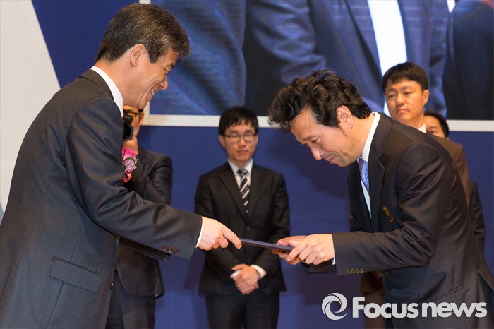 (과천=포커스뉴스) 10일 오전 경기도 과천시민회관에서 열린 '제5회 유권자의 날 기념식'에서 이인복(왼쪽) 중앙선거관리위원장이 배우 안석환에게 국민포장을 전달하고 있다.