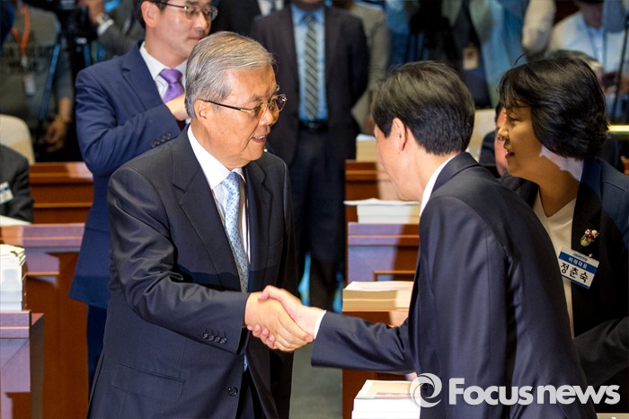 (서울=포커스뉴스) 김종인(왼쪽) 더불어민주당 비상대책 위원장과 우상호 원내대표가 10일 오전 서울 여의도 국회에서 열린 초선 당선자 워크숍에 참석해 악수 하고 있다.