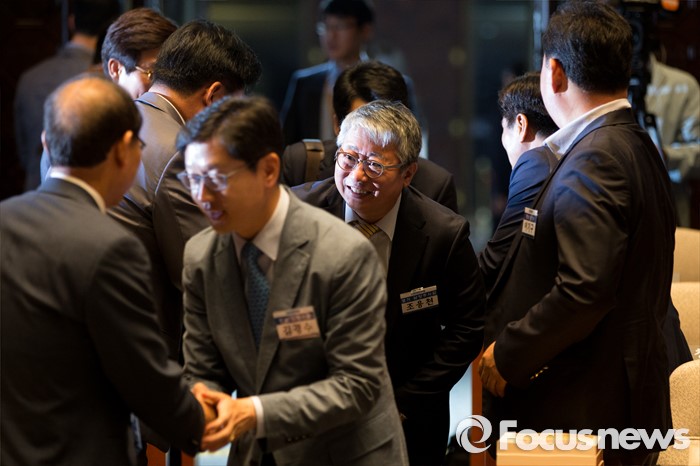 (서울=포커스뉴스) 조응천 더불어민주당 당선자가 10일 오전 서울 여의도 국회에서 열린 초선 당선자 워크숍에서 다선자들과 악수 하고 있다.