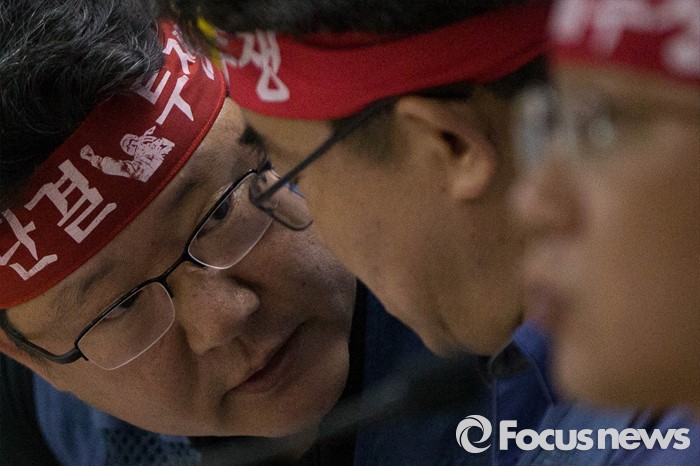 (서울=포커스뉴스) 10일 오전 서울 영등포구 한국노총회관에서 열린 '양대노총 공공부문 공대위 기자회견'에 참석한 노조원들이 이야기를 나누고 있다.