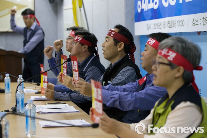 (서울=포커스뉴스) 10일 오전 서울 영등포구 한국노총회관에서 열린 '양대노총 공공부문 공대위 기자회견'에 참석한 공동위원장들이 정부의 해고연봉제, 강제퇴출제, 불법 강압에 반대하며 구호를 외치고 있다.