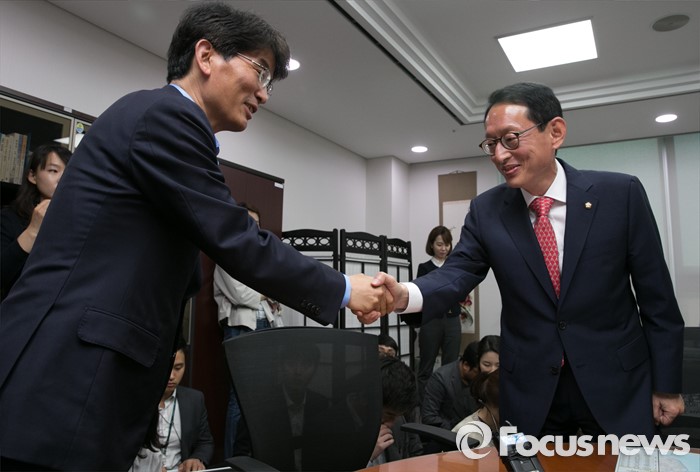 (서울=포커스뉴스) 김도읍(오른쪽) 새누리당 원내수석부대표와 박완주 더불어민주당 원내수석부대표가 10일 오후 서울 여의도 국회 의원회관에서 오는 13일 예정된 박근혜 대통령과 여야 신임 원내지도부 회동 의제 조율을 위한 논의에 앞서 인사하고 있다.