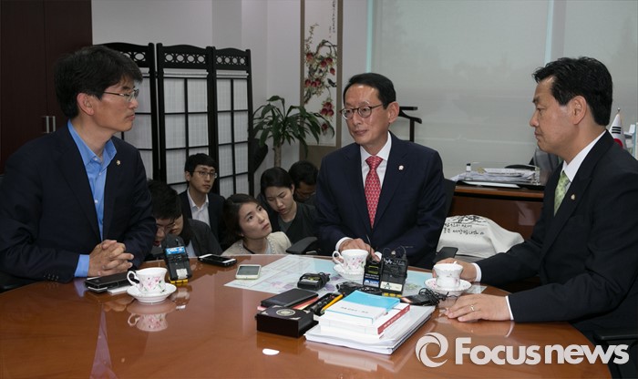 (서울=포커스뉴스) 김도읍(가운데) 새누리당 원내수석부대표, 박완주(왼쪽) 더불어민주당 원내수석부대표, 김관영 국민의당 원내수석부대표가 10일 오후 서울 여의도 국회 의원회관에서 박근혜 대통령과 여야 신임 원내지도부 회동 의제 조율을 위한 논의를 하고 있다.