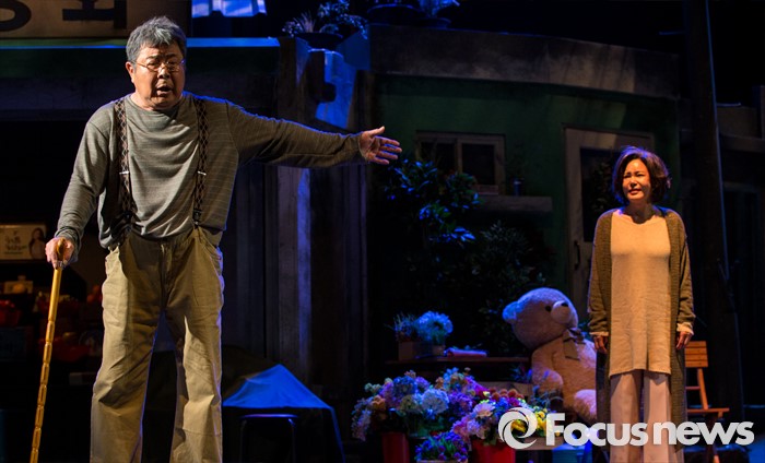 (서울=포커스뉴스) 10일 오후 서울 종로구 동숭아트센터에서 열린 연극 '장수상회' 프레스콜에 참석한 배우 백일섭, 김지숙이 극의 주요장면을 시연하고 있다.