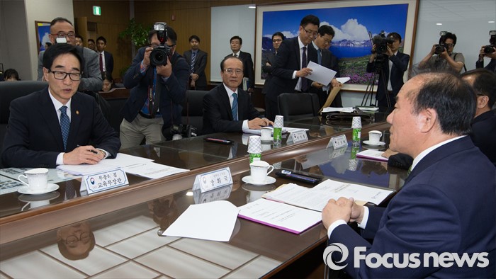 (세종=포커스뉴스) 이준식(왼쪽) 사회부총리 겸 교육부장관이 10일 오후 세종시 정부세종청사 교육부 중회의실에서 열린 전국시도교육감협의회 회장단 간담회에 참석해 인사말을 하고 있다.