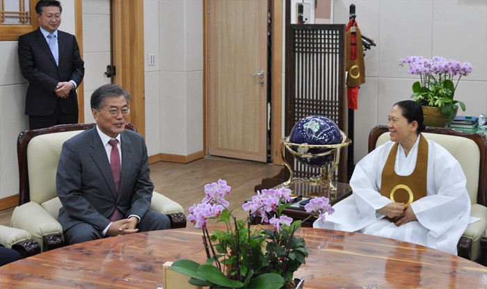 (서울=포커스뉴스) 문재인(왼쪽) 더불어민주당 전 대표가 10일 오후 전북 익산시 원불교 총부를 방문해 한은숙 원불교 교정원장과 면담을 하고 있다. <사진제공=원불교중앙총부>
