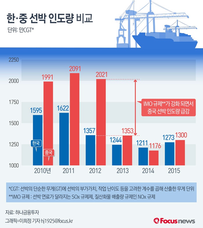 (서울=포커스뉴스) IMO의 선박 연비 경쟁과 강화되고 있는 환경규제는 부족한 중국 조선 업에 커다란 장벽으로 작용하고 있다. 8일 하나금융투자가 발표한 자료에 따르면 2013년을 시작으로 중국의 선박 인도량은 급격히 감소되었다.