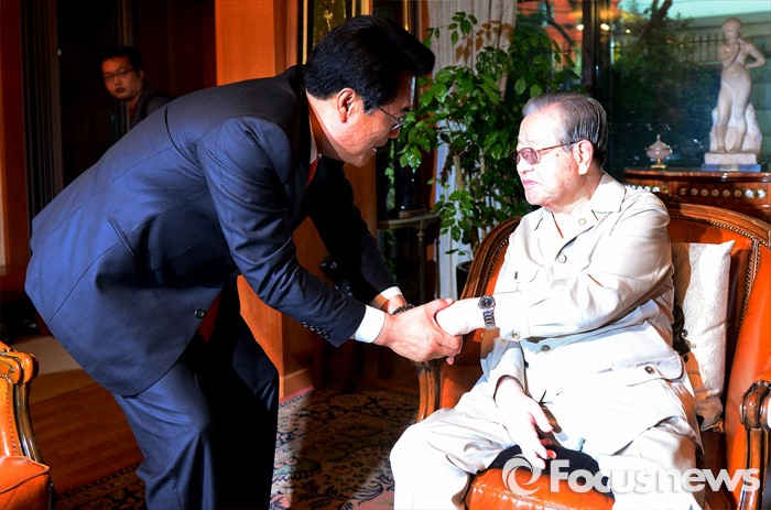 (서울=포커스뉴스) 정진석(왼쪽) 새누리당 원내대표가 10일 오후 서울 중구 김종필 전 총리 자택을 방문해 김 전 총리에게 인사하고 있다.