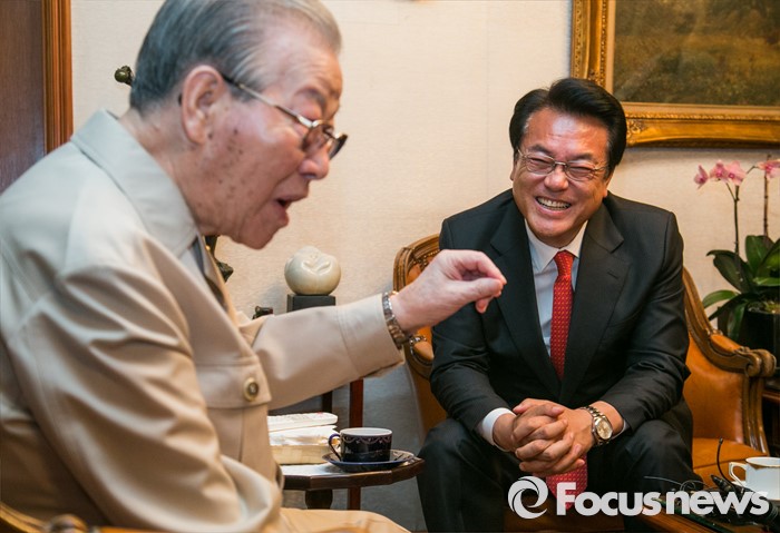 (서울=포커스뉴스) 정진석(오른쪽) 새누리당 원내대표가 10일 오후 서울 중구 김종필 전 총리 자택을 방문해 김 전 총리와 환담을 하고 있다.