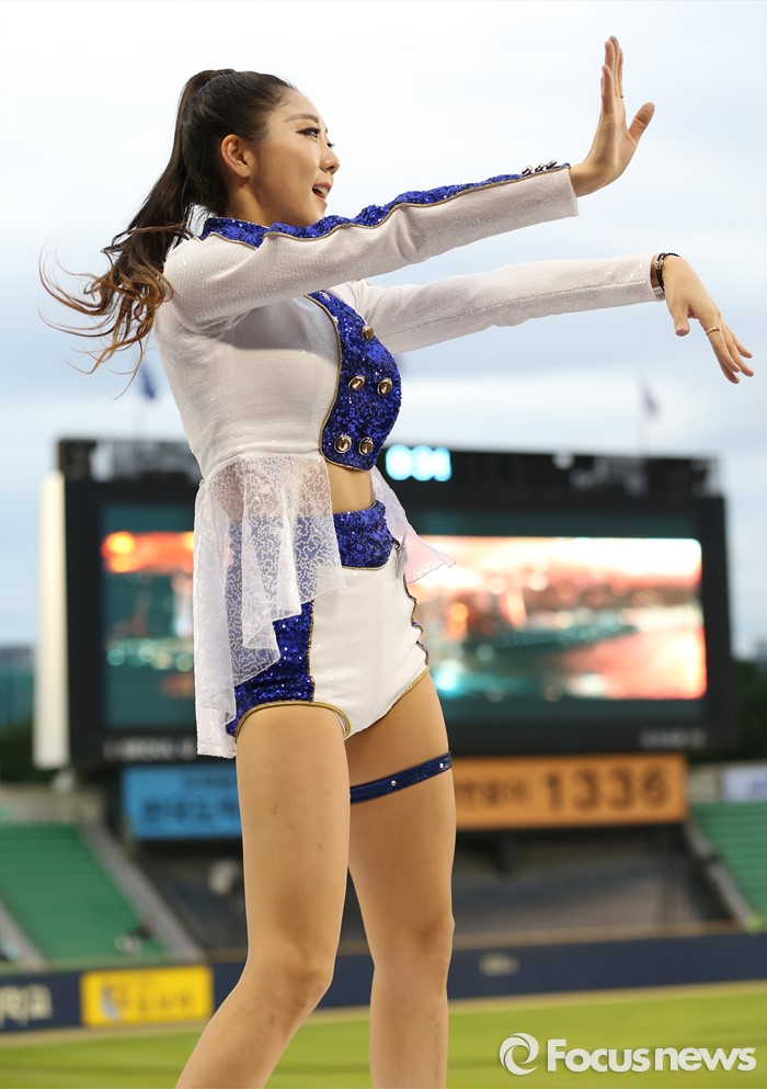 (서울=포커스뉴스) 10일 서울 잠실구장에서 열린 2016 프로야구 삼성-LG 경기에서 삼성 치어리더가 승리를 부르는 손짓으로 관중들의 응원을 유도하고 있다.