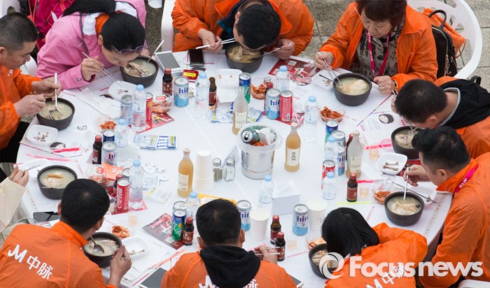(서울=포커스뉴스) 10일 오후 서울 서초구 반포한강공원에서 중국 건강보조제품 회사 중마이과기발전유한공사 소속 임직원들이 삼계탕 만찬을 즐기고 있다.