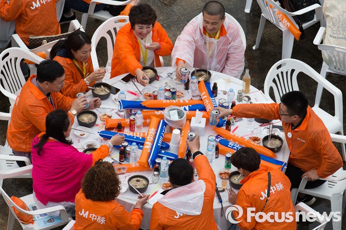 (서울=포커스뉴스) 10일 오후 서울 서초구 반포한강공원에서 중국 건강보조제품 회사 중마이과기발전유한공사 소속 임직원들이 삼계탕 만찬을 즐기고 있다.