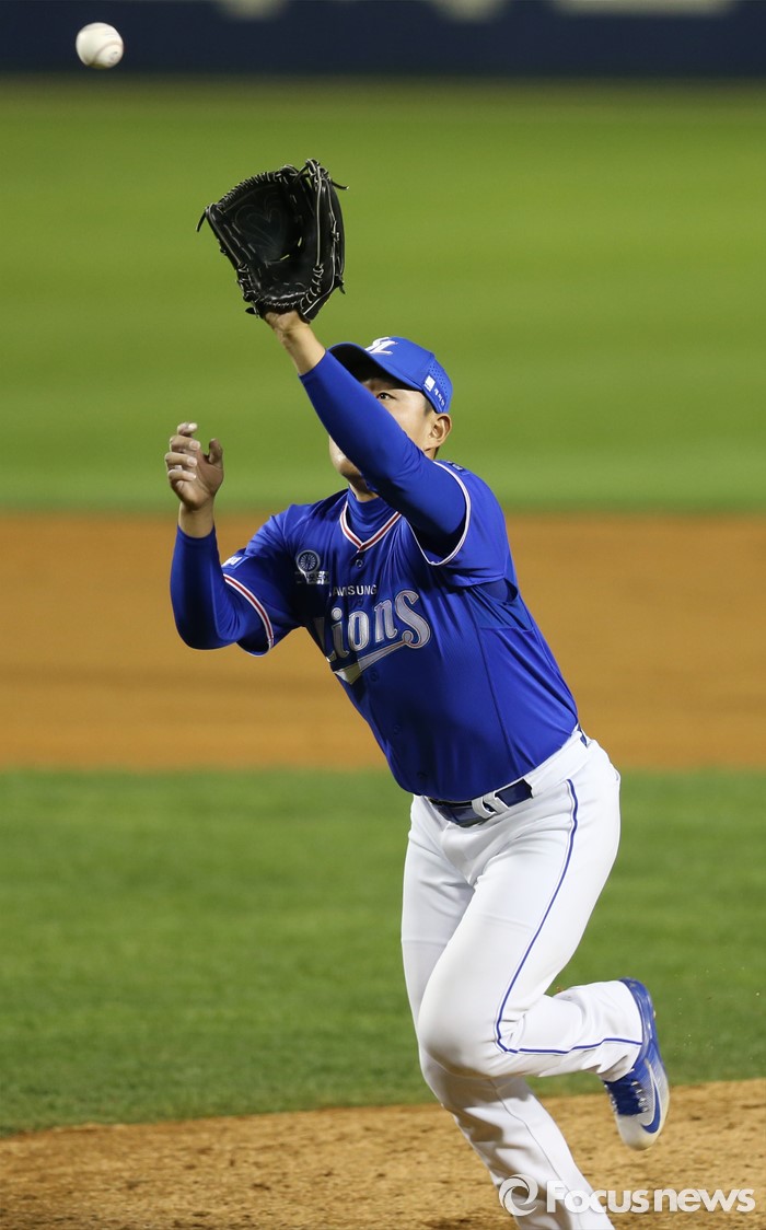 (서울=포커스뉴스) 10일 서울 잠실구장에서 열린 2016 프로야구 삼성-LG 경기 6회말 1사 만루에서 삼성 투수 김동호가 LG 히메네스의 투수앞 땅볼을 잡고 있다.