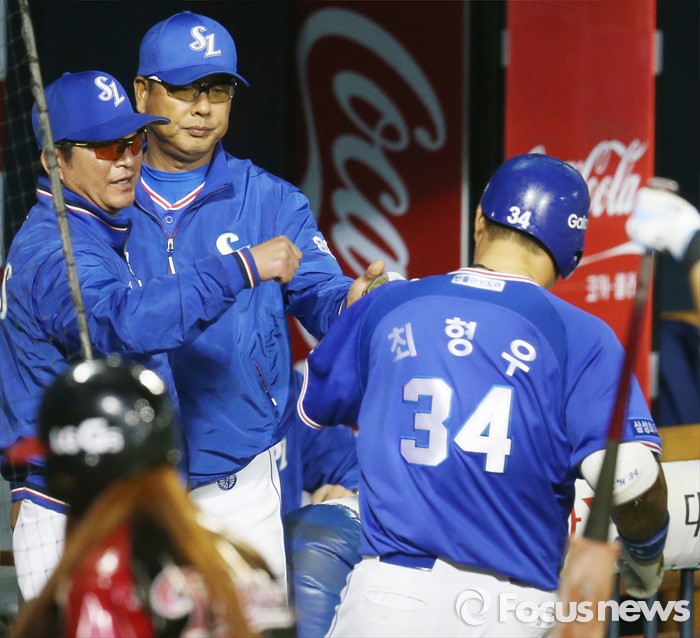(서울=포커스뉴스) 10일 서울 잠실구장에서 열린 2016 프로야구 삼성-LG 경기에서 삼성 류중일 감독이 홈런을 치고 들어오는 최형우를 마중하고 있다.
