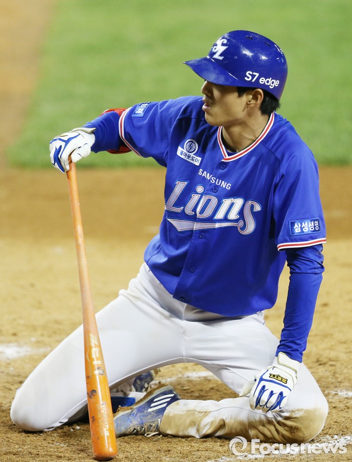 (서울=포커스뉴스) 10일 서울 잠실구장에서 열린 2016 프로야구 삼성-LG 경기 6회초 삼성 선두타자 구자욱이 몸쪽 볼을 피해 넘어졌다 일어나고 있다.