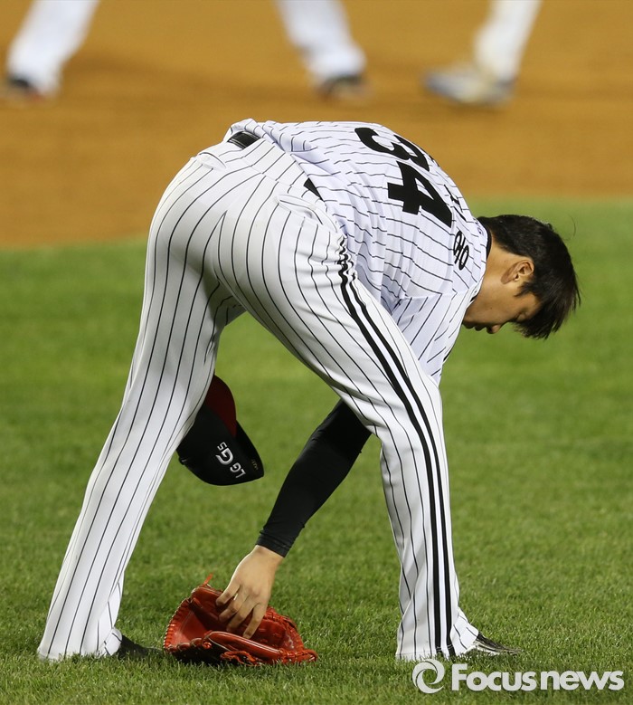(서울=포커스뉴스) 10일 서울 잠실구장에서 열린 2016 프로야구 삼성-LG 경기 8회초 1사 1,2루에서 삼성 최형우에게 우월 3점 홈런을 맞은 LG 윤지웅이 내팽개친 글러브를 줍고 있다.