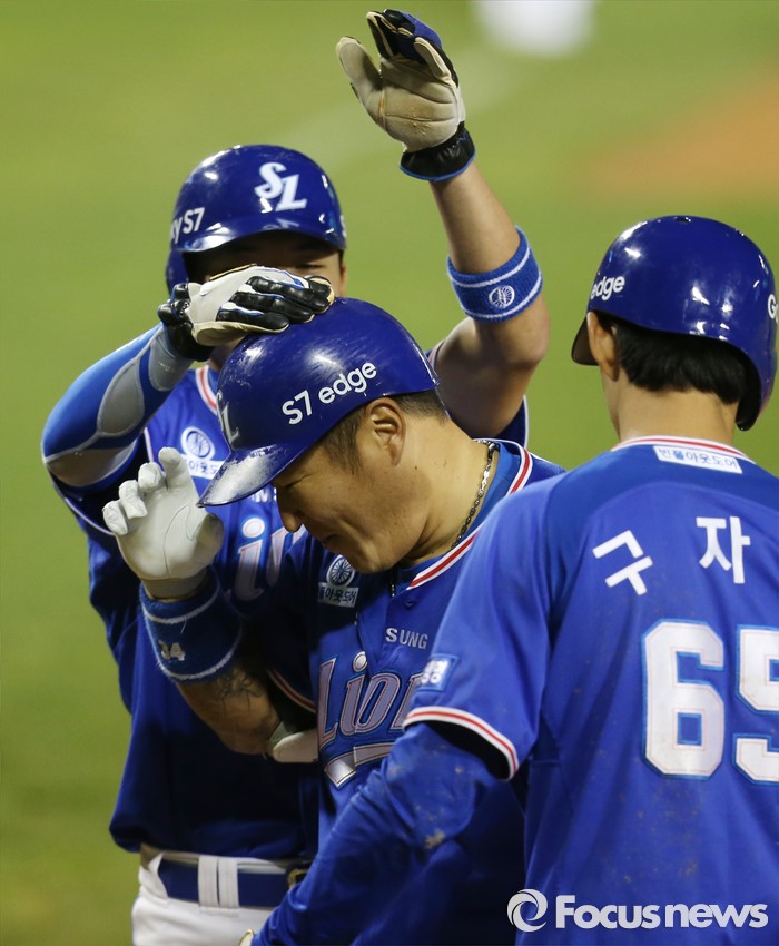 (서울=포커스뉴스) 10일 서울 잠실구장에서 열린 2016 프로야구 삼성-LG 경기 8회초 1사 1,2루에서 삼성 최형우가 우월 3점 홈런을 치고 선행주자의 환영을 받으며 홈인하고 있다.