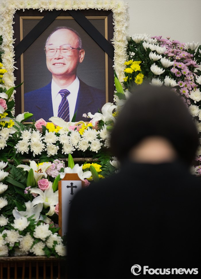 (서울=포커스뉴스) 10일 오후 서울 송파구 서울아산병원 장례식장에 마련된 故 강영훈 전 국무총리의 빈소에서 한 조문객이 조문하고 있다.