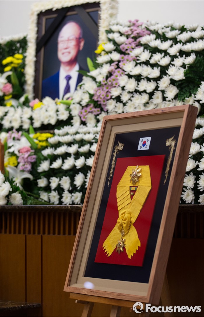 (서울=포커스뉴스) 10일 오후 서울 송파구 서울아산병원 장례식장에 마련된 故 강영훈 전 국무총리의 빈소에 국민훈장 무궁화장이 놓여져 있다.