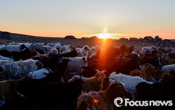 (바가 가즈링 촐로/몽골=포커스뉴스)바가 가즈링 촐로의 유목민들이 기르는 염소들 사이로 아침해가 솟아오르고 있다.