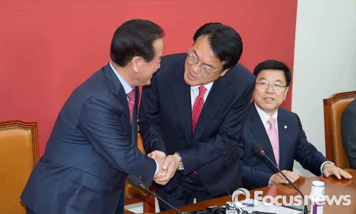 (서울=포커스뉴스) 정진석(가운데) 새누리당 원내대표가 11일 오전 서울 여의도 국회에서 원내지도부-중진의원 연석회의에 참석해 정갑윤(왼쪽) 의원과 인사하고 있다. 오른쪽은 김광림 정책위의장.