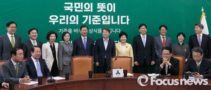 (서울=포커스뉴스) 11일 오전 서울 여의도 국회에서 열린 국민의당 최고위원회의에 참석한 안철수(뒷줄 오른쪽 여섯번째) 상임공동대표, 천정배(뒷줄 왼쪽 다섯번째) 공동대표가 신임 당직자들과 함께 취재진을 향해 포즈를 취하고 있다.