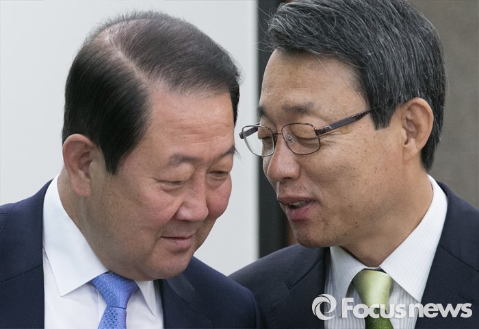 (서울=포커스뉴스) 11일 오전 서울 여의도 국회에서 열린 국민의당 최고위원회의에 참석한 김성식(오른쪽) 정책위의장과 박주선 최고위원이 대화하고 있다.
