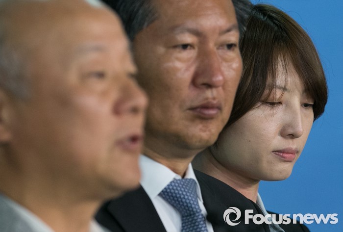 (서울=포커스뉴스) 정청래(가운데) 더불어민주당 의원, 백남기 농민의 딸 도라지(오른쪽) 씨, 백남기대책위 관계자들이 11일 오전 서울 여의도 국회 정론관에서 백남기 농민 진압 책임자 처벌과 재발방지를 위한 국회 청문회 실시 촉구 기자회견을 하고 있다.