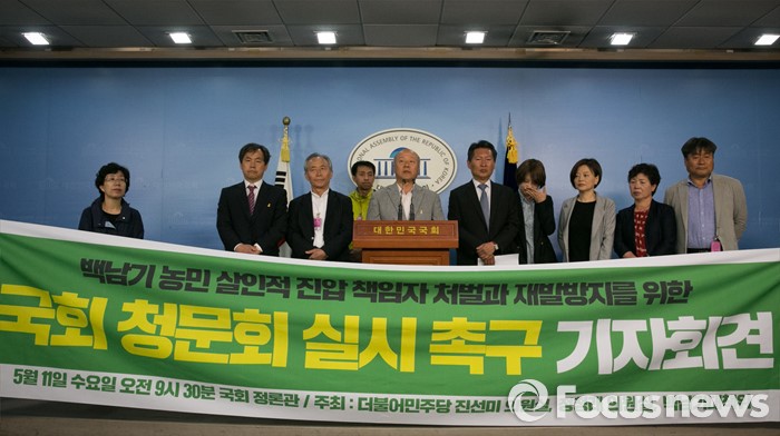 (서울=포커스뉴스) 정청래, 진선미 더불어민주당 의원과 백남기대책위 관계자들이 11일 오전 서울 여의도 국회 정론관에서 백남기 농민 진압 책임자 처벌과 재발방지를 위한 국회 청문회 실시 촉구 기자회견을 하고 있다.