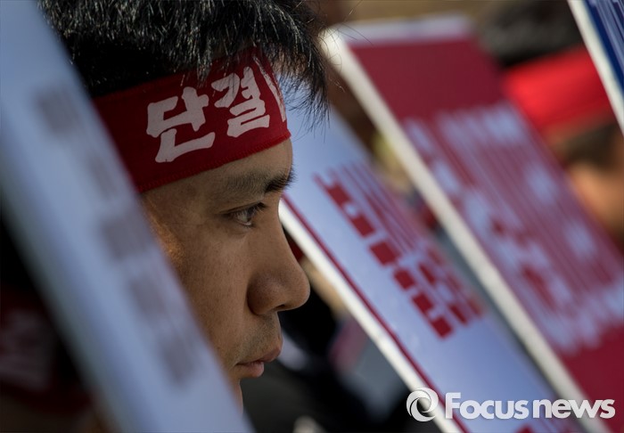(서울=포커스뉴스) 11일 오전 서울 영등포구 여의도 국민은행 앞에서 양대노총 공공부문 공대위 주최로 열린 '성과연봉제ㆍ강제퇴출제 저지 천막농성' 돌입집회 참가자가 생각에 잠겨 있다.