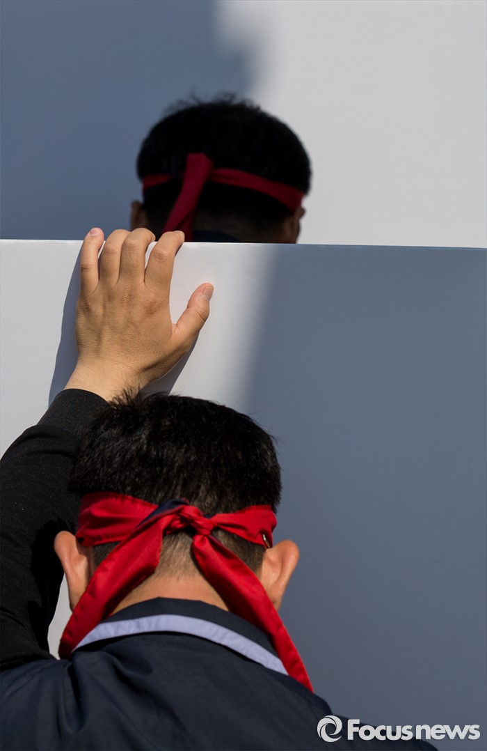 (서울=포커스뉴스) 11일 오전 서울 영등포구 여의도 국민은행 앞에서 양대노총 공공부문 공대위 주최로 열린 '성과연봉제ㆍ강제퇴출제 저지 천막농성' 돌입집회 참가자들이 손팻말을 들고 있다.