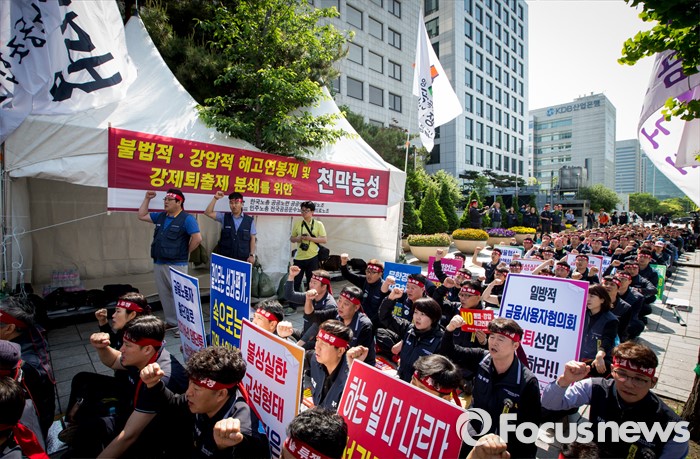 (서울=포커스뉴스) 11일 오전 서울 영등포구 여의도 국민은행 앞에서 양대노총 공공부문 공대위 주최로 열린 '성과연봉제ㆍ강제퇴출제 저지 천막농성' 돌입집회 참가자들이 구호를 외치고 있다.