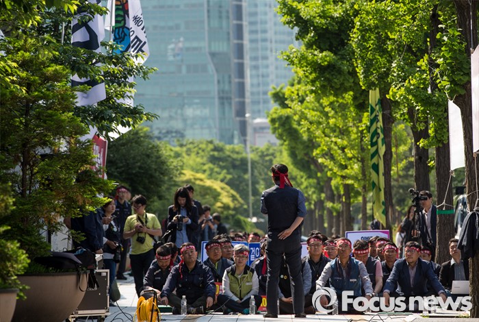 (서울=포커스뉴스) 11일 오전 서울 영등포구 여의도 국민은행 앞에서 양대노총 공공부문 공대위 주최로 열린 '성과연봉제ㆍ강제퇴출제 저지 천막농성' 돌입집회 참가자들이 발언을 듣고 있다.