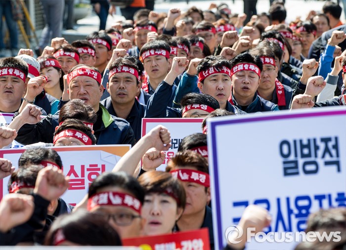 (서울=포커스뉴스) 11일 오전 서울 영등포구 여의도 국민은행 앞에서 양대노총 공공부문 공대위 주최로 열린 '성과연봉제ㆍ강제퇴출제 저지 천막농성' 돌입집회 참가자들이 구호를 외치고 있다.